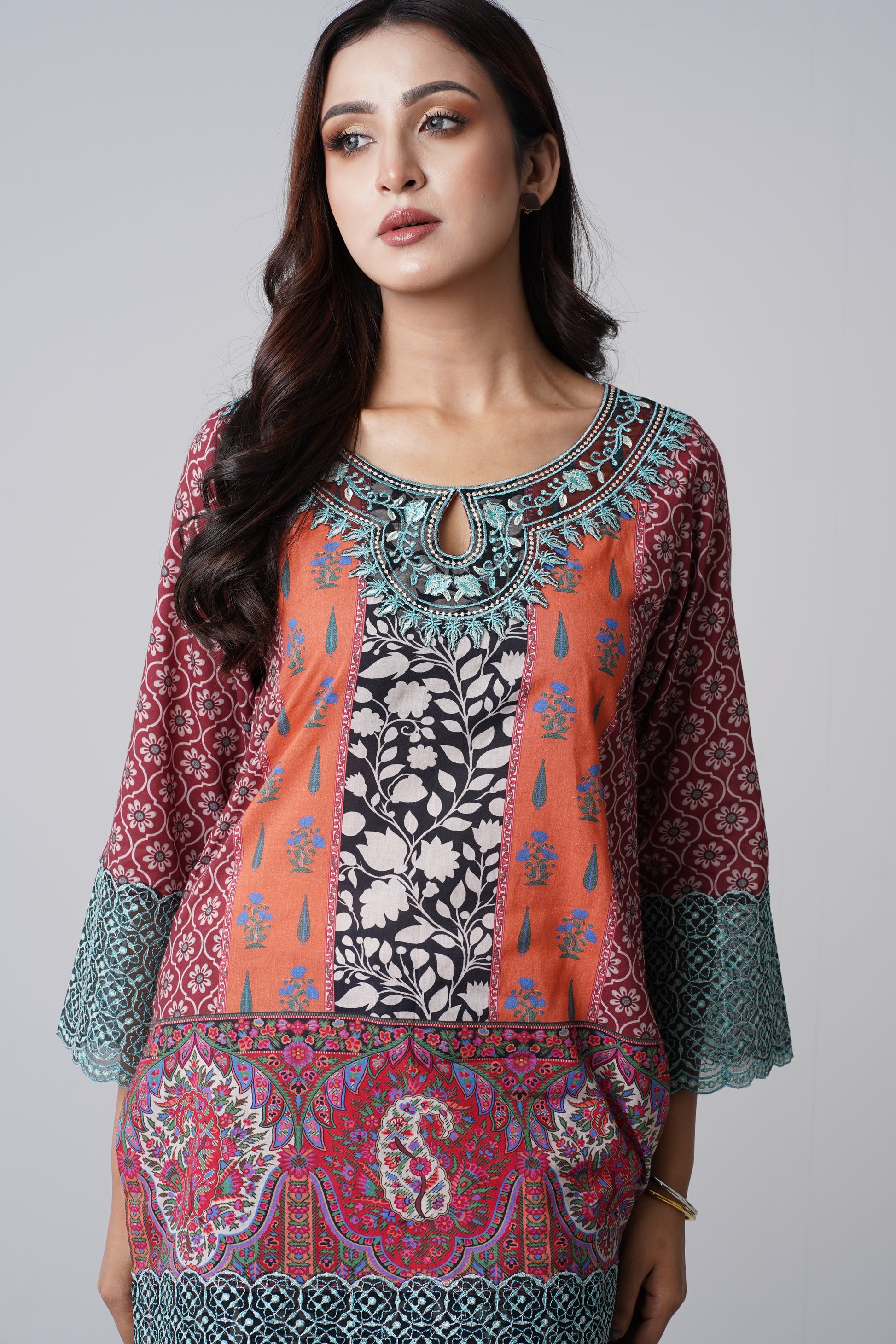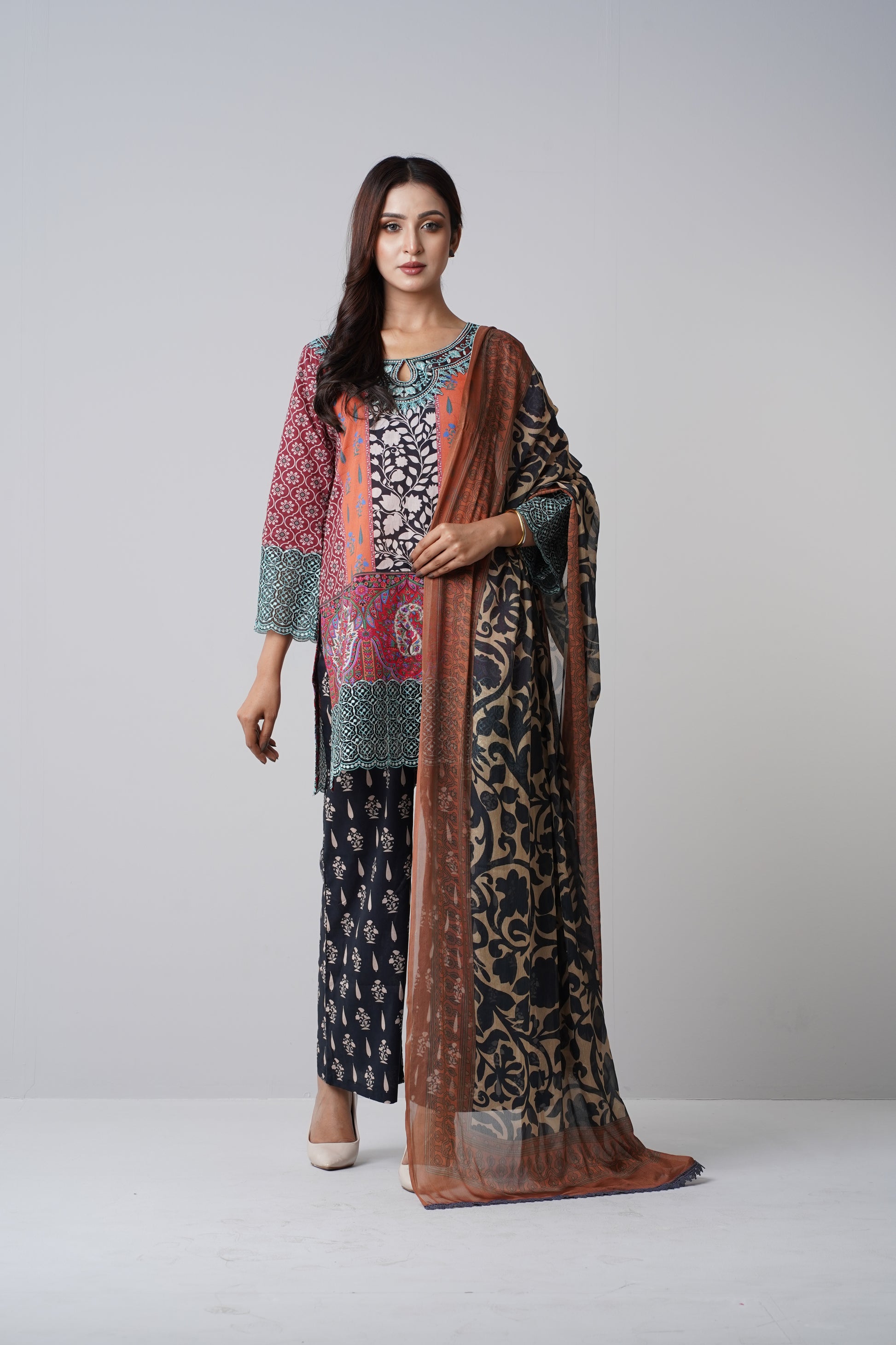 A vibrant unstitched 3-piece ensemble featuring a multicolor printed lawn shirt, paired with a luxurious printed organza silk dupatta and a classic black cotton trouser. Perfect for both everyday styling and semi-formal we