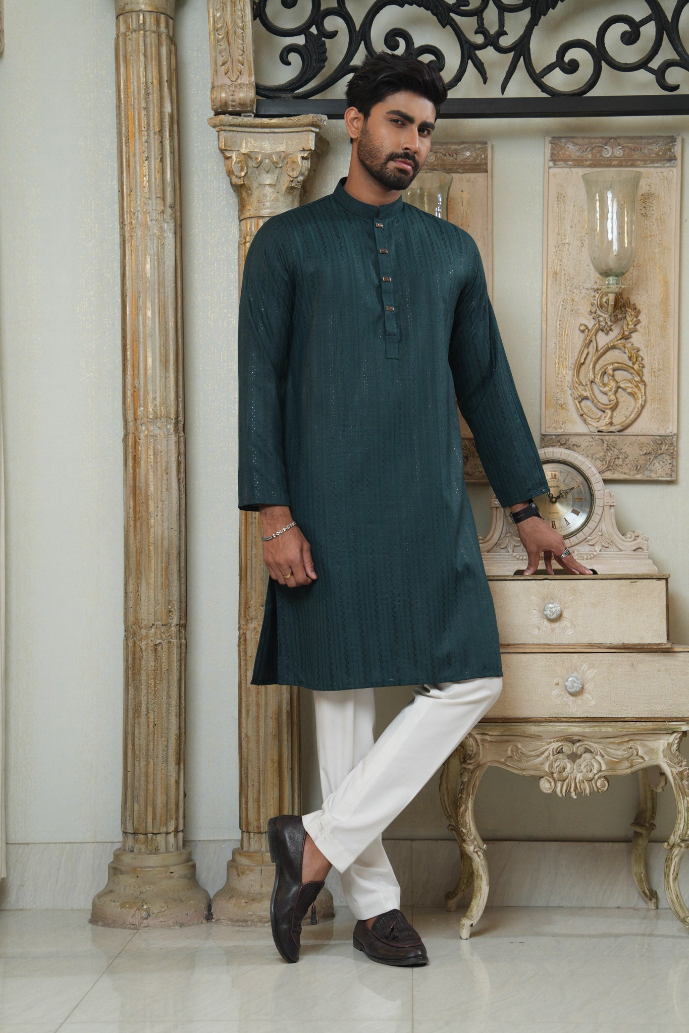 A regular-fit Panjabi crafted from Sequence Jacquard Cotton, featuring on band and cuff with decorative Show buttons, offers a stylish yet comfortable formal look. Perfect for effortless elegance and all-day ease.