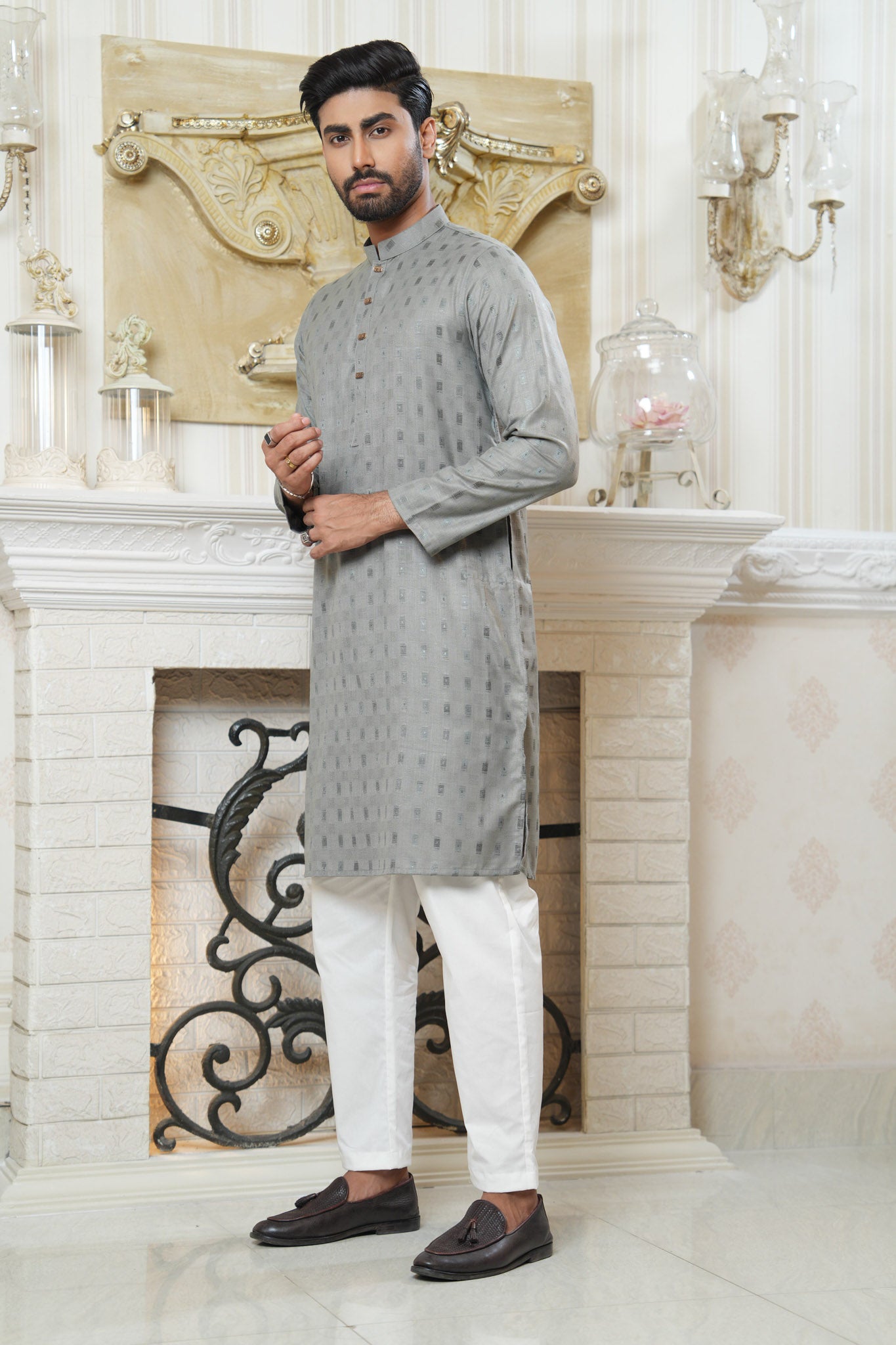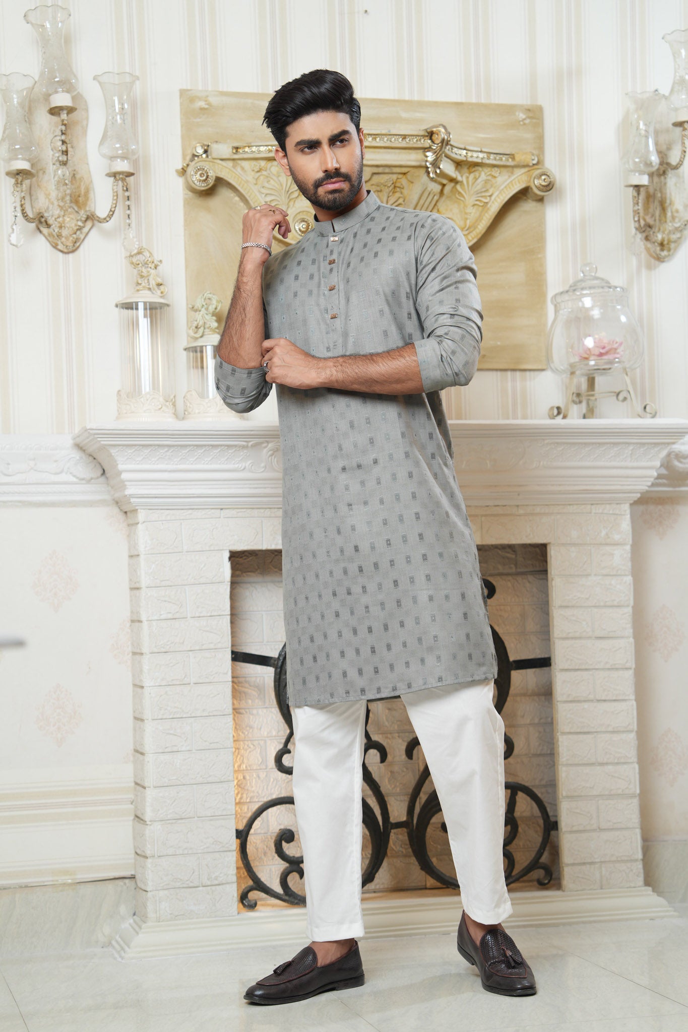 A slim fit Panjabi crafted from 100% cotton Jacquard fabric, featuring hidden placket detailing offers a stylish yet comfortable semi formal look. Perfect for effortless elegance and all-day ease.