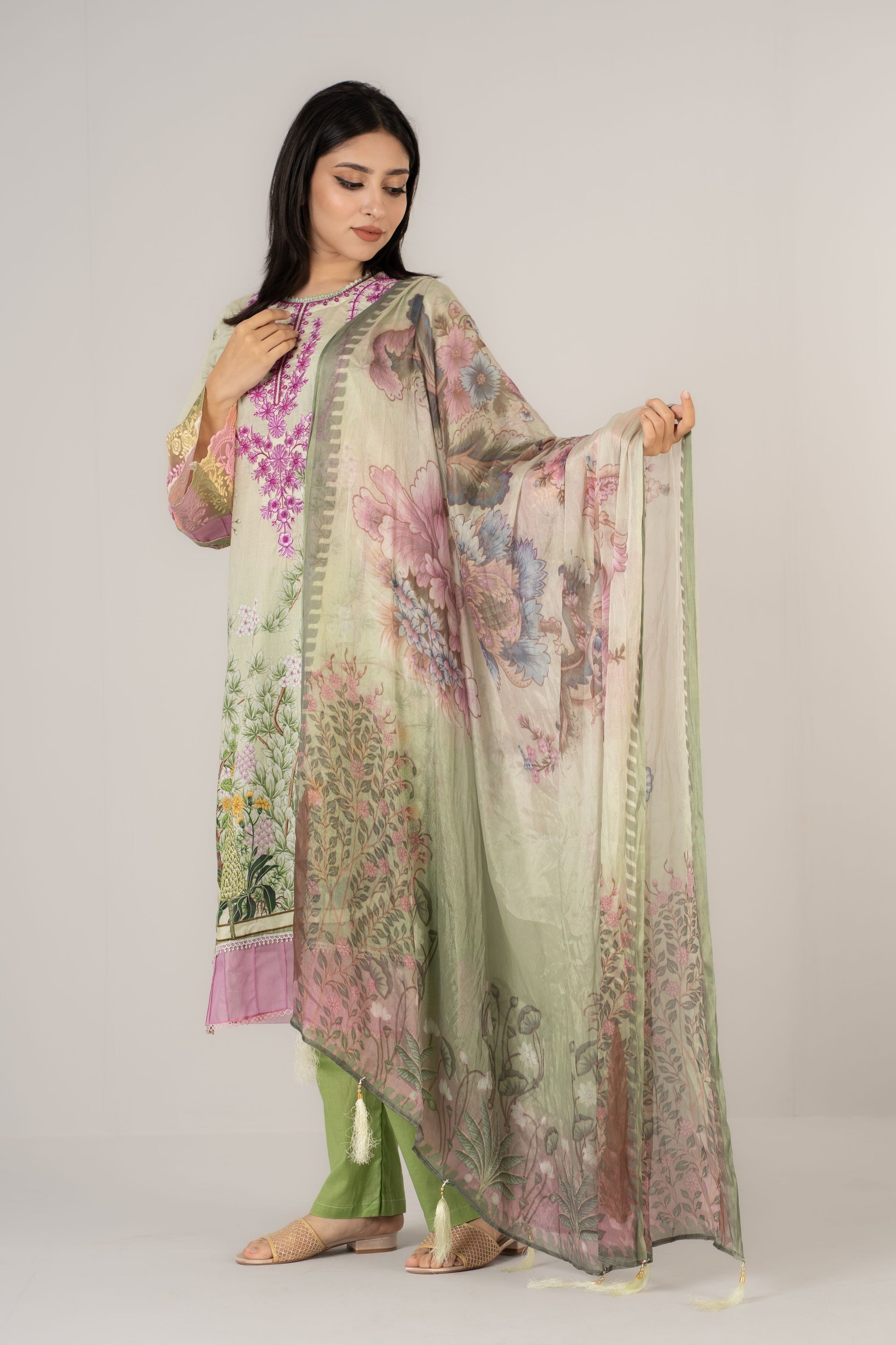 Step into timeless elegance with this beautifully designed 3-piece lawn outfit, perfect for any occasion. The soft pastel green base is delicately adorned with vibrant floral prints and intricate embroidery in shades of pink and lavender, creating a graceful and refreshing look.