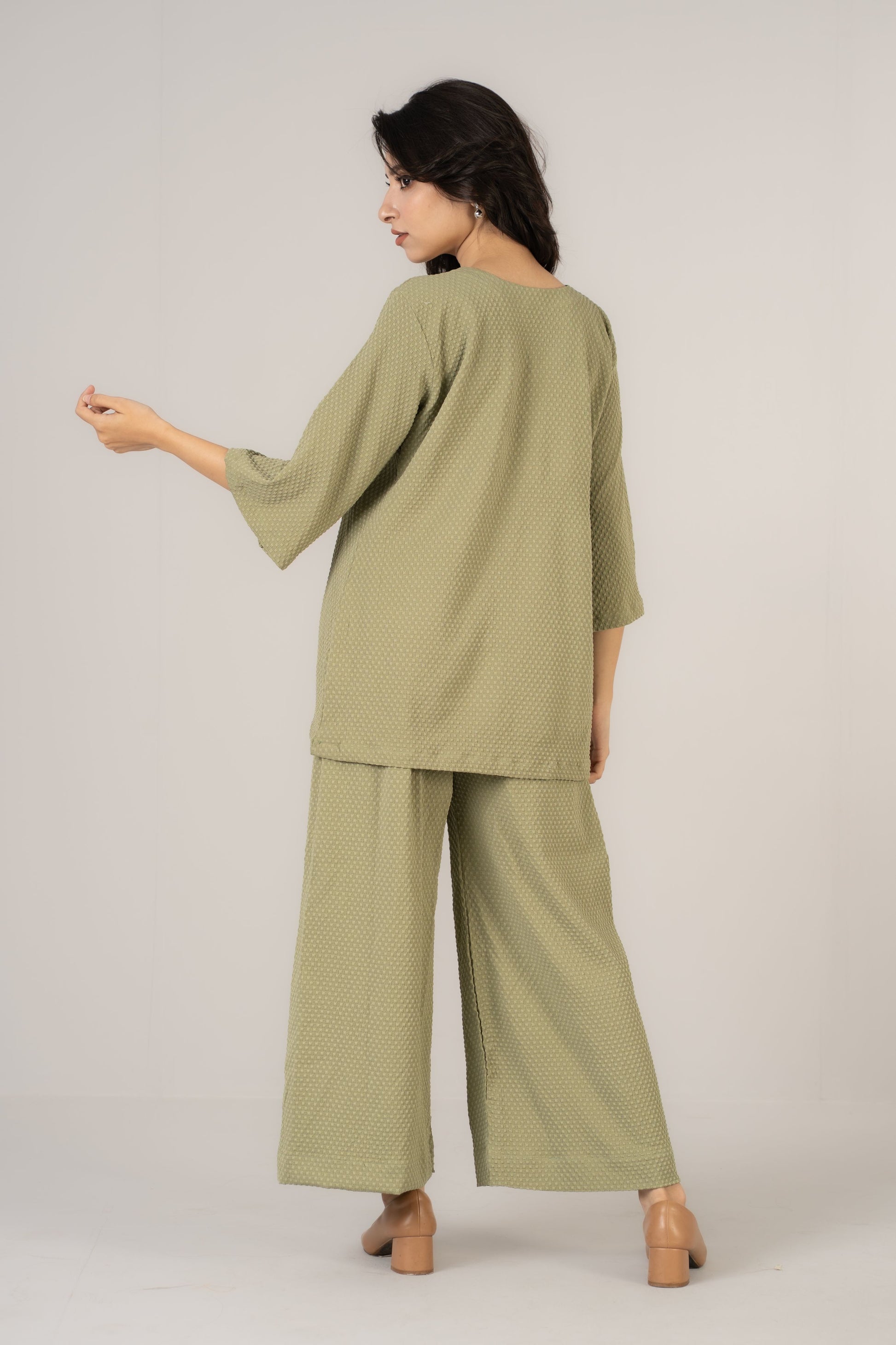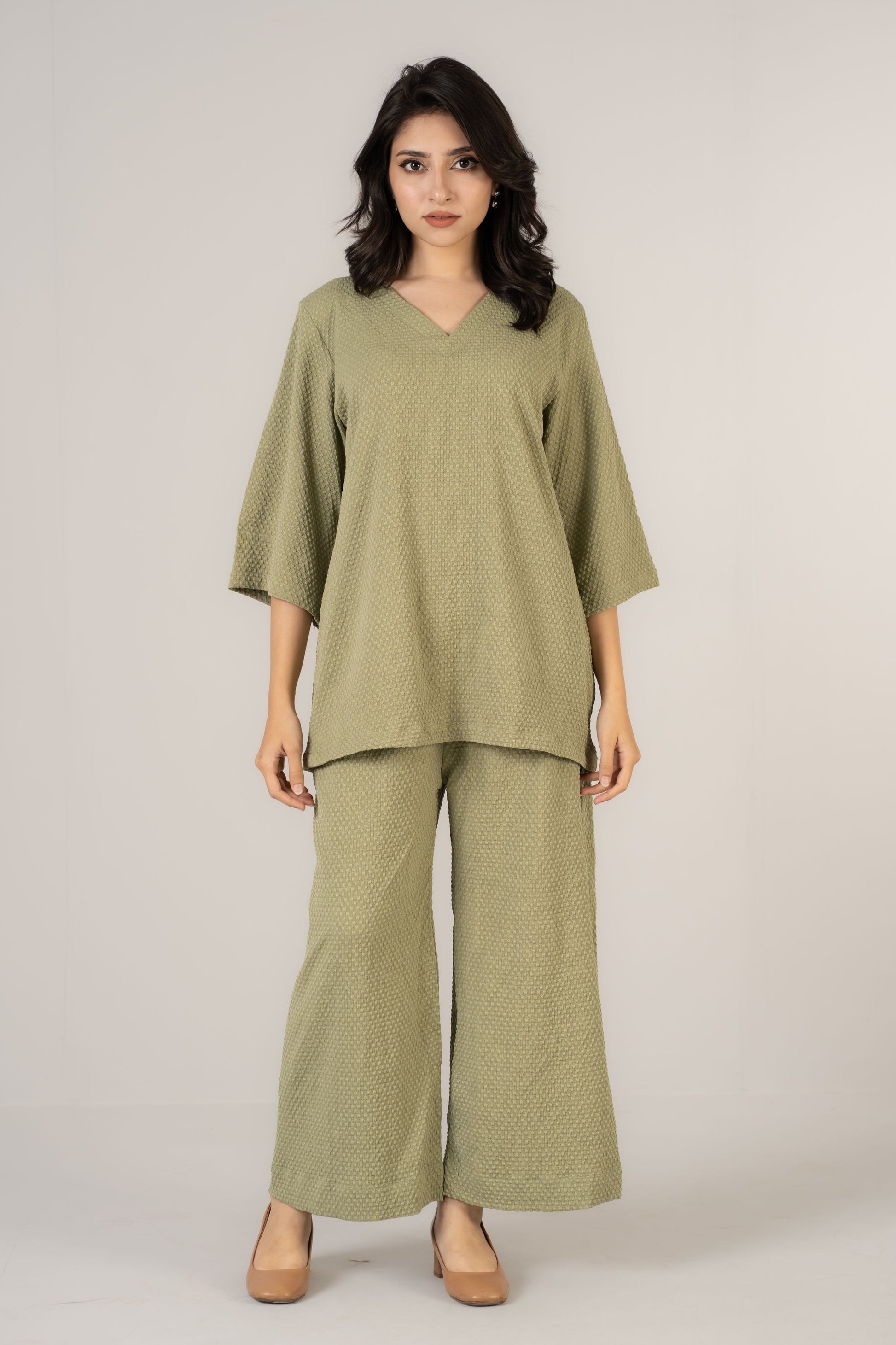 Olive Green Textured Co-Ord Set – Minimal Chic Lounge Wear
