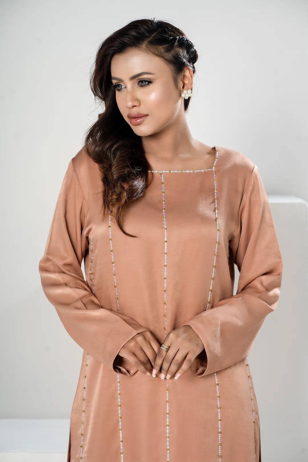 Description: A long floral printed kurta featuring full sleeves with lace inserts, a neckline with a Round.