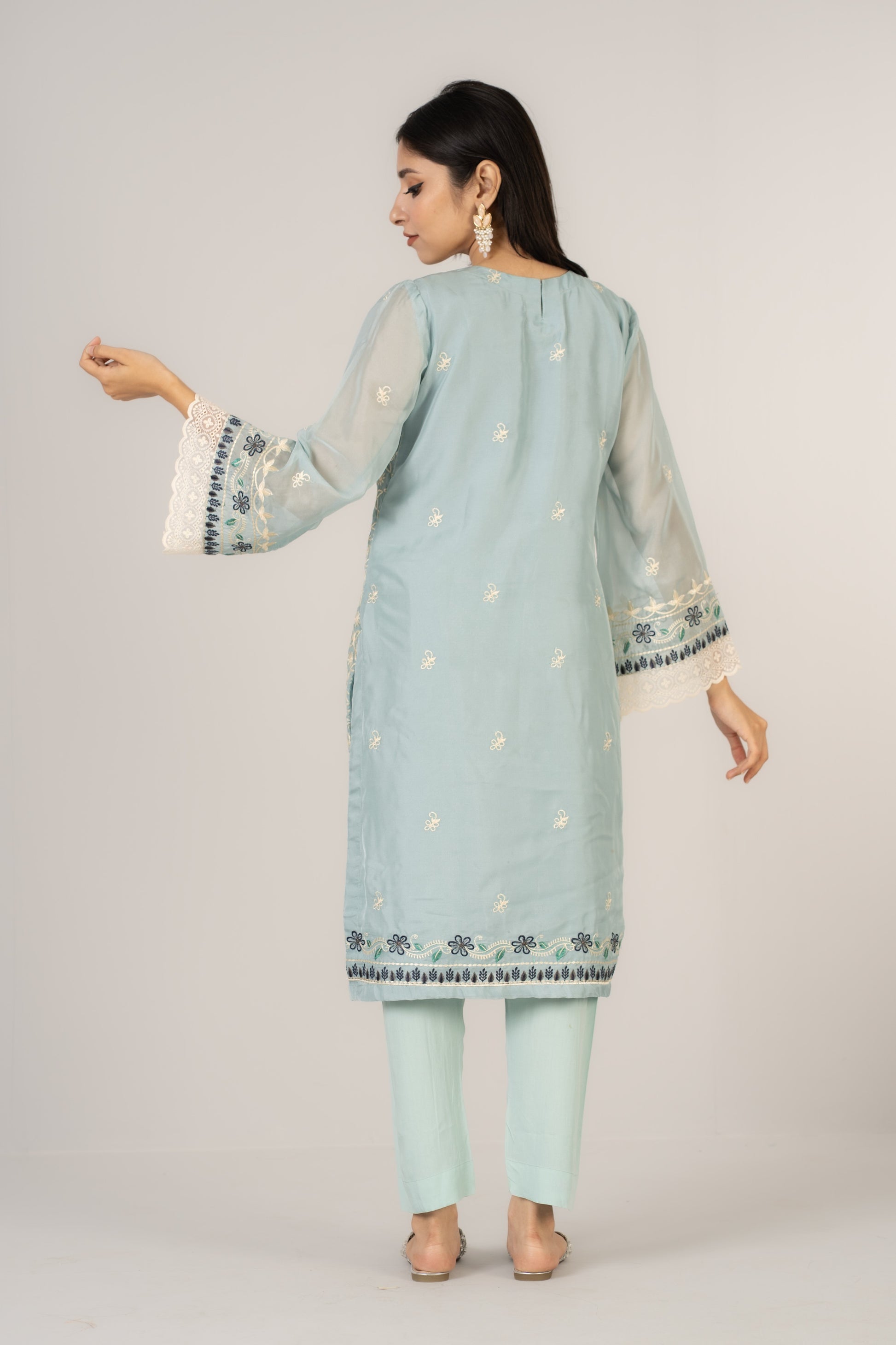The straight-cut kurta features intricate embroidery on the neckline, borders, and sleeves, finished with lace detailing for an extra feminine touch. It comes paired with straight trousers and a matching embroidered chiffon dupatta that completes the ensemble with effortless charm.