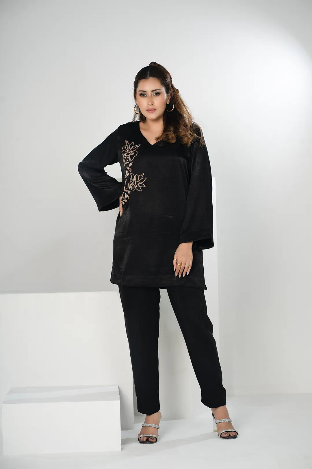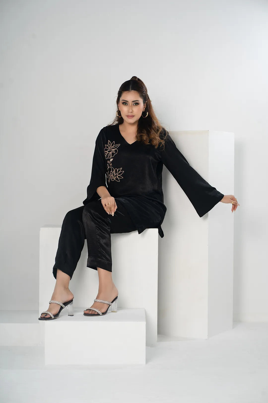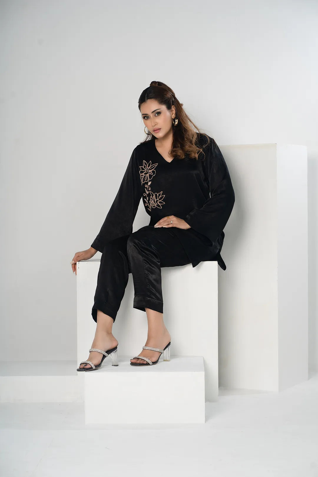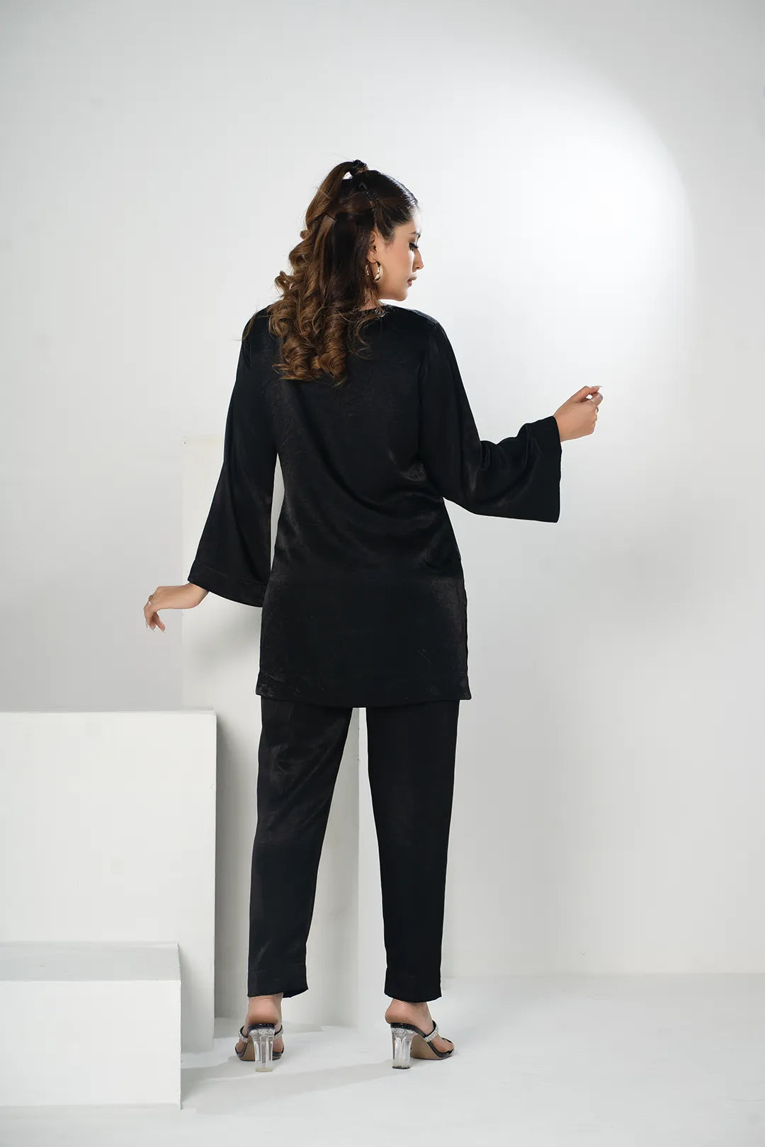 Step into timeless elegance with this sophisticated black two-piece suit, crafted for effortless style and comfort. The flowy crepe silk top features a chic keyhole neckline and long sleeves with elasticized cuffs, offering a modern yet graceful silhouette. Paired with tailored black trousers, this ensemble is perfect for work, formal events, or casual chic styling.