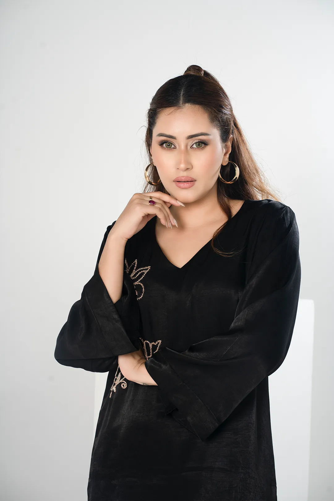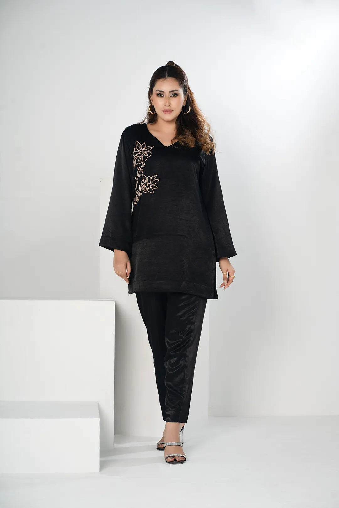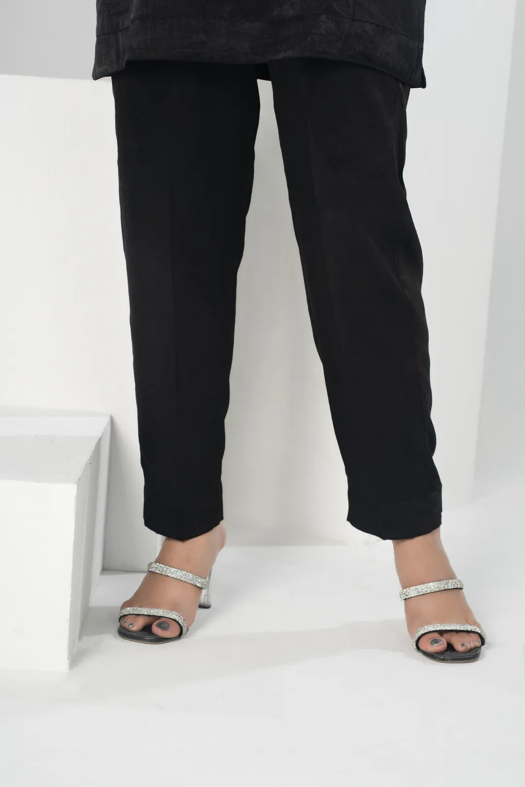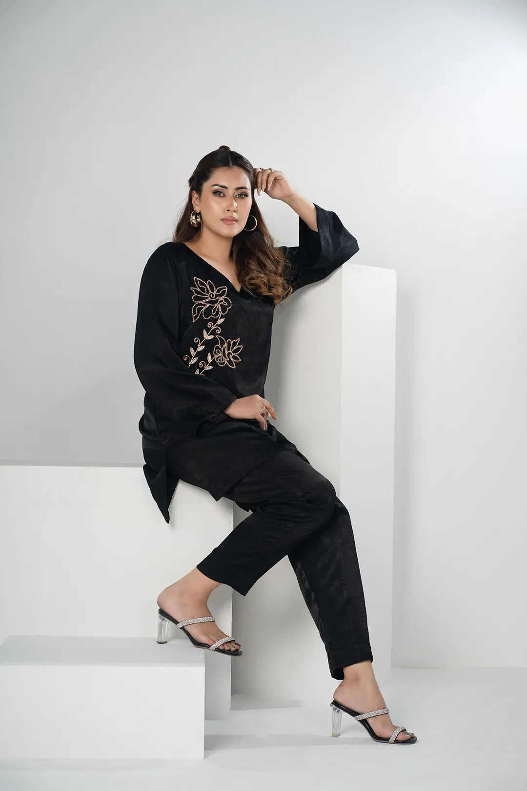 Step into timeless elegance with this sophisticated black two-piece suit, crafted for effortless style and comfort. The flowy crepe silk top features a chic keyhole neckline and long sleeves with elasticized cuffs, offering a modern yet graceful silhouette. Paired with tailored black trousers, this ensemble is perfect for work, formal events, or casual chic styling.