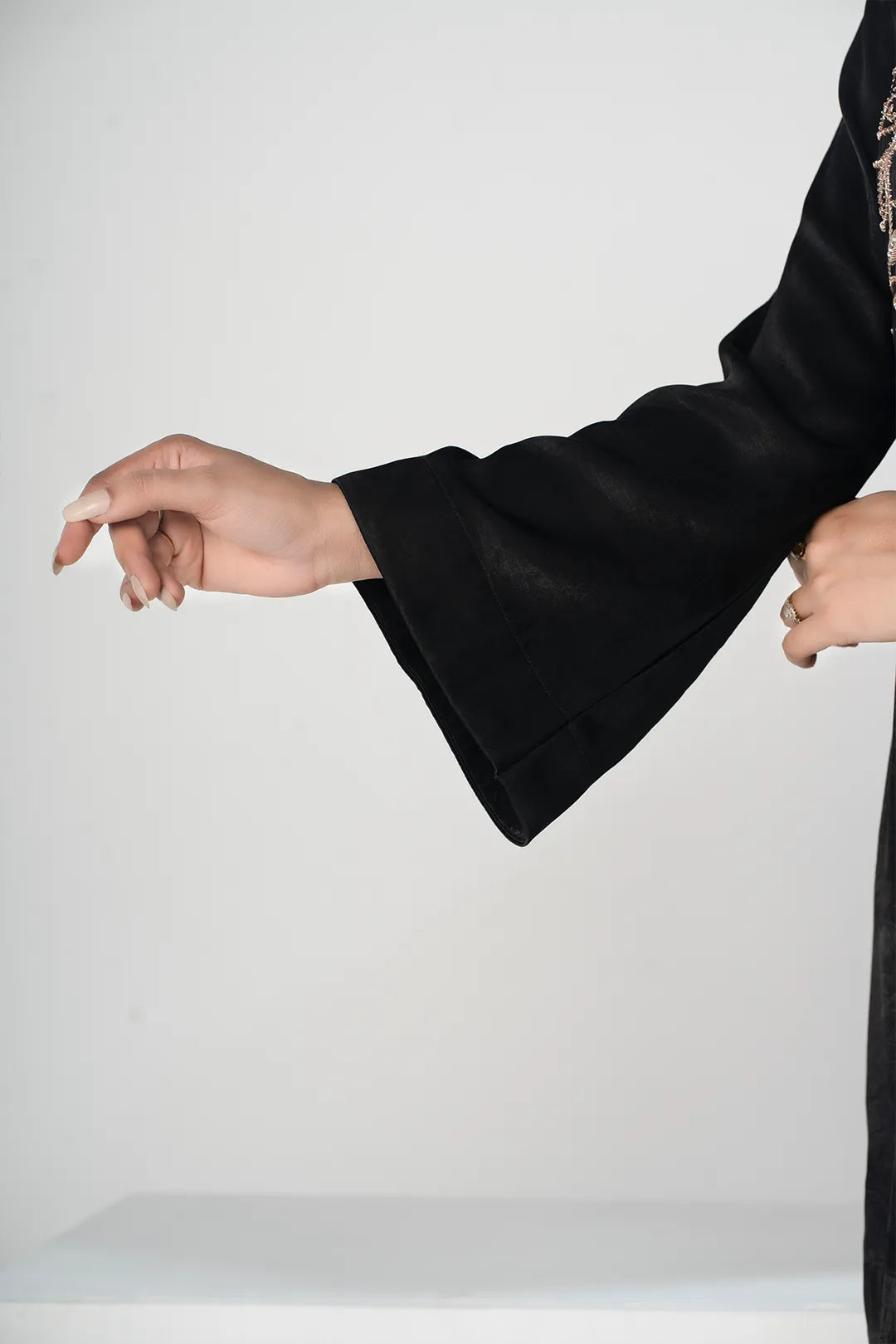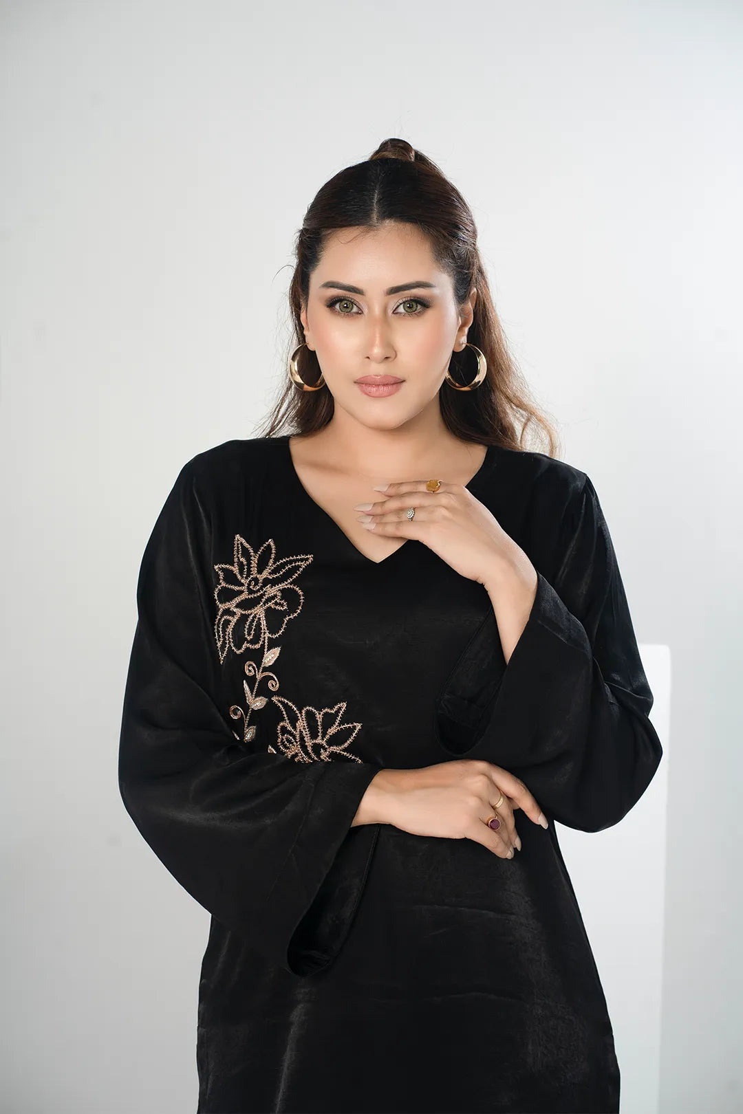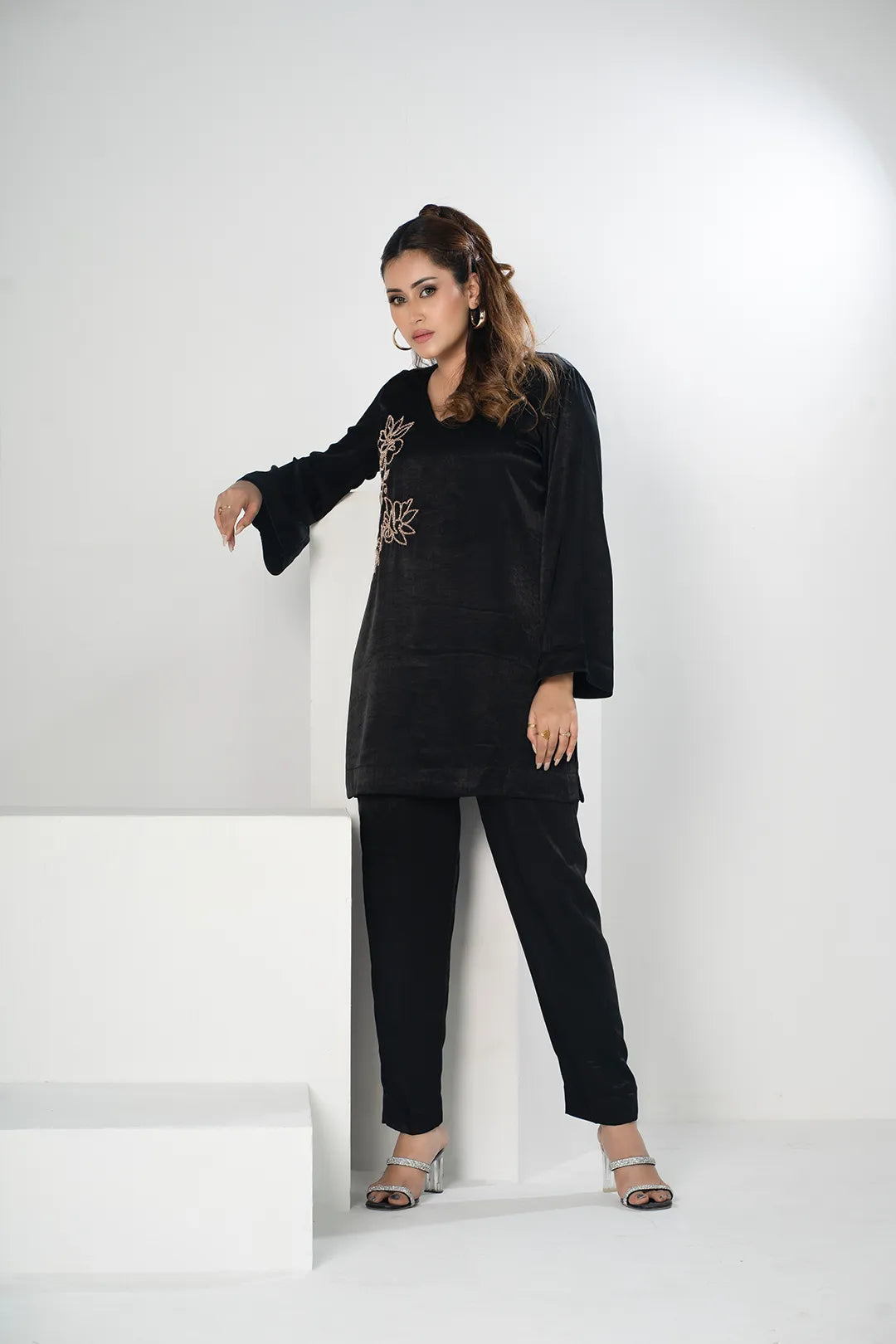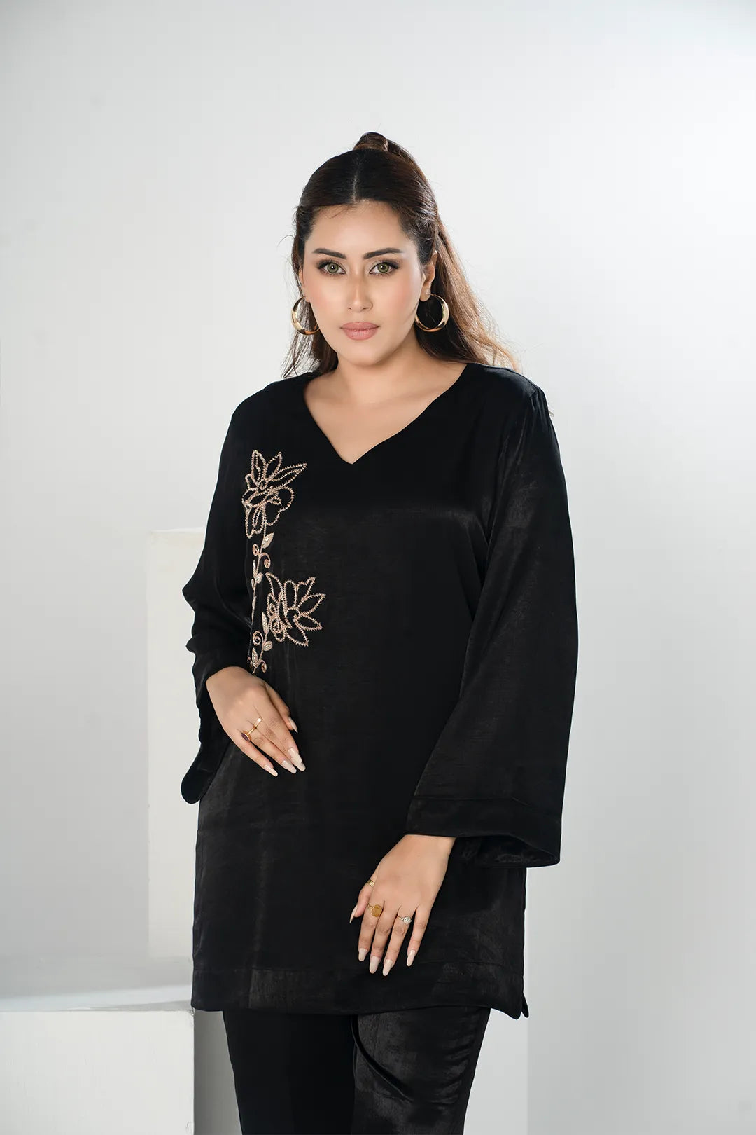 Step into timeless elegance with this sophisticated black two-piece suit, crafted for effortless style and comfort. The flowy crepe silk top features a chic keyhole neckline and long sleeves with elasticized cuffs, offering a modern yet graceful silhouette. Paired with tailored black trousers, this ensemble is perfect for work, formal events, or casual chic styling.