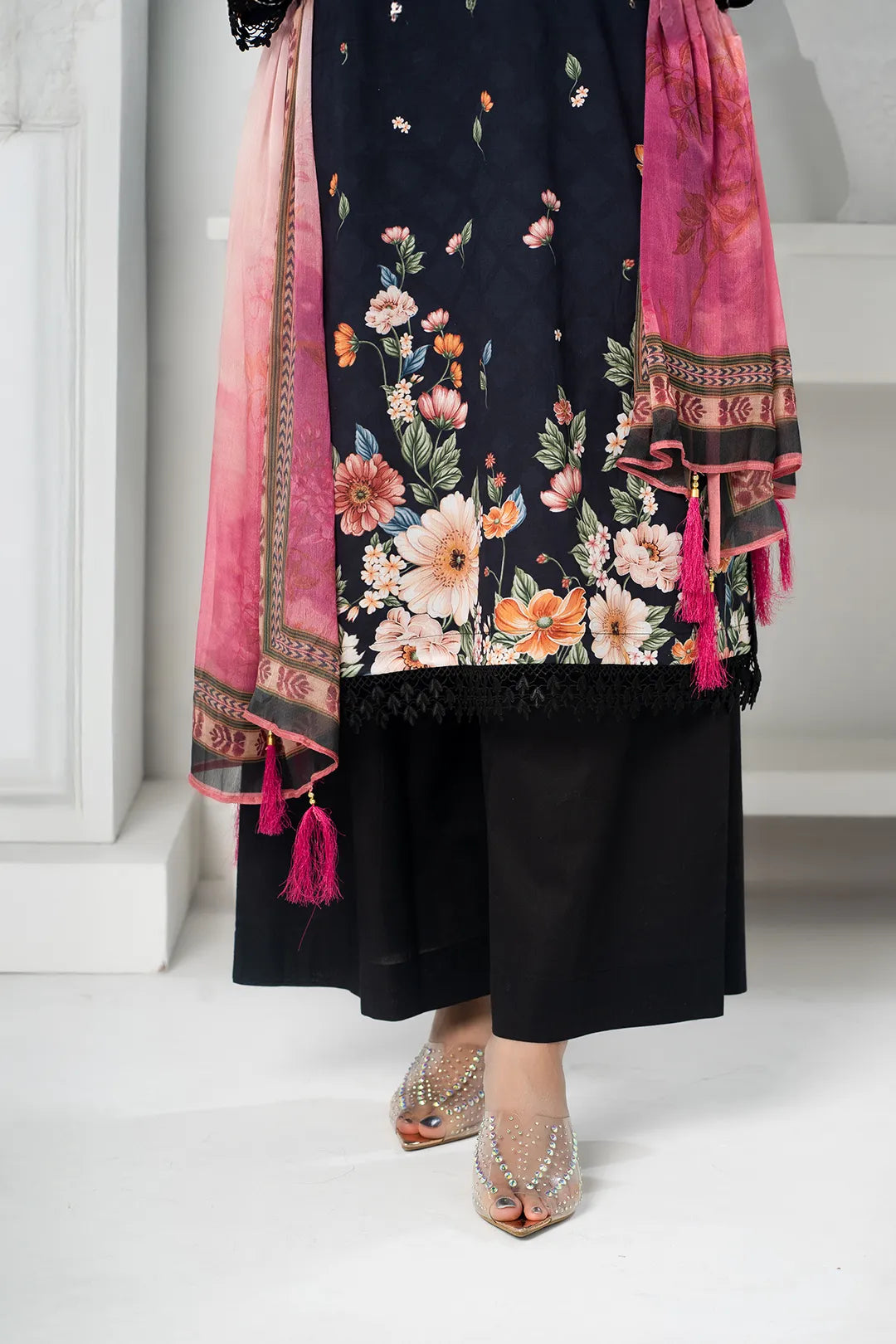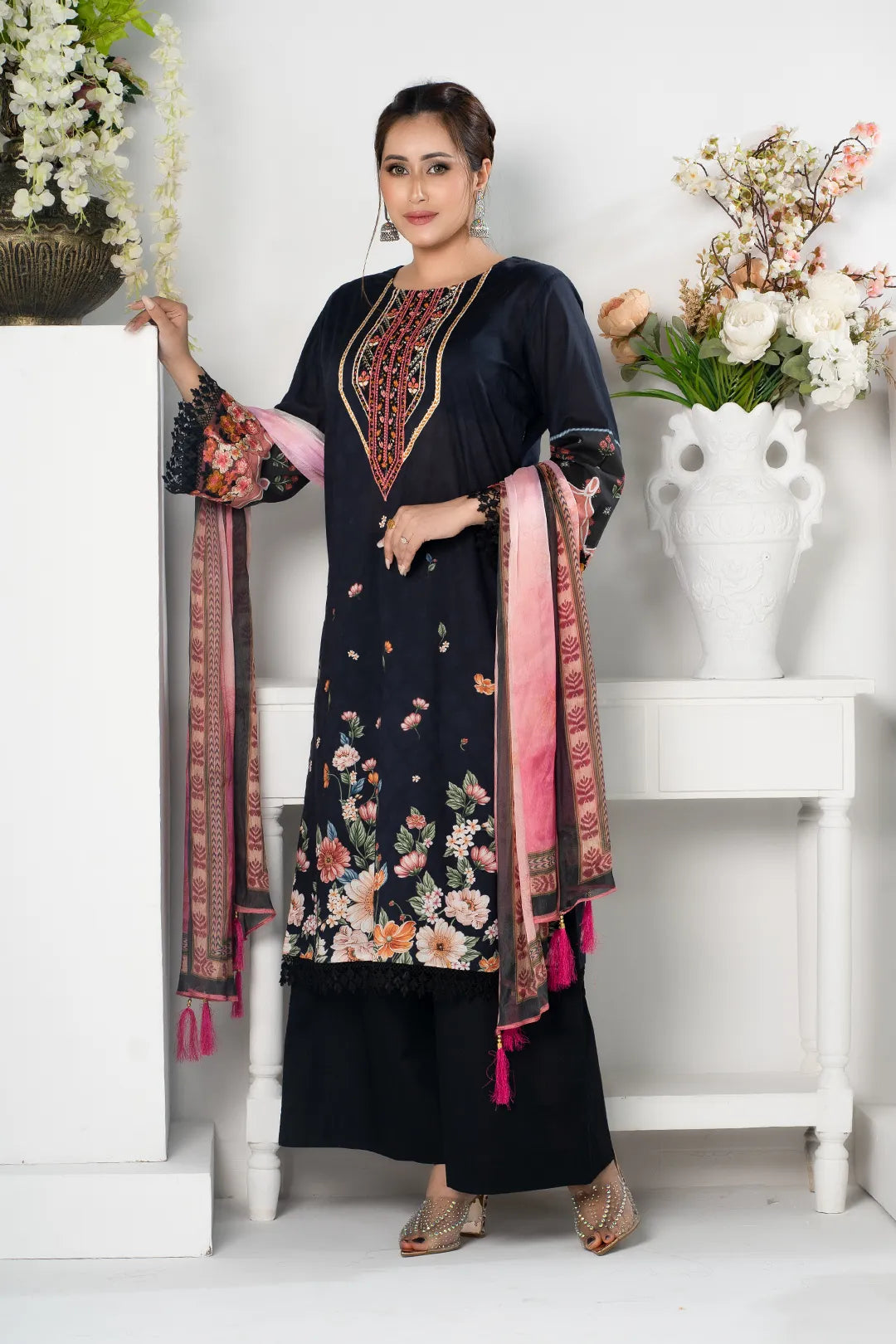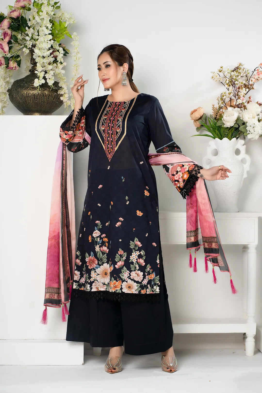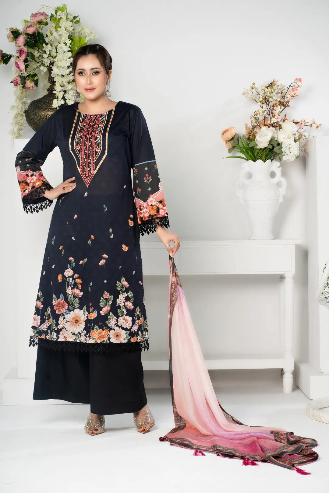 This exquisite three-piece set is a celebration of artistry and elegance, featuring vibrant digital prints with delicate embroidery and cotton lace detailing on premium lawn & organza fabric. The design includes a gracefully adorned long shirt with intricate details, paired with matching trousers and a beautifully coordinated dupatta. Perfect for festive occasions, this ensemble blends traditional craftsmanship with contemporary sophistication.