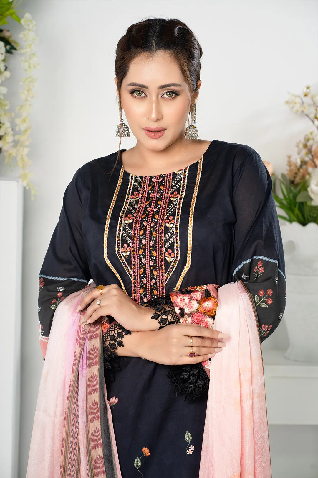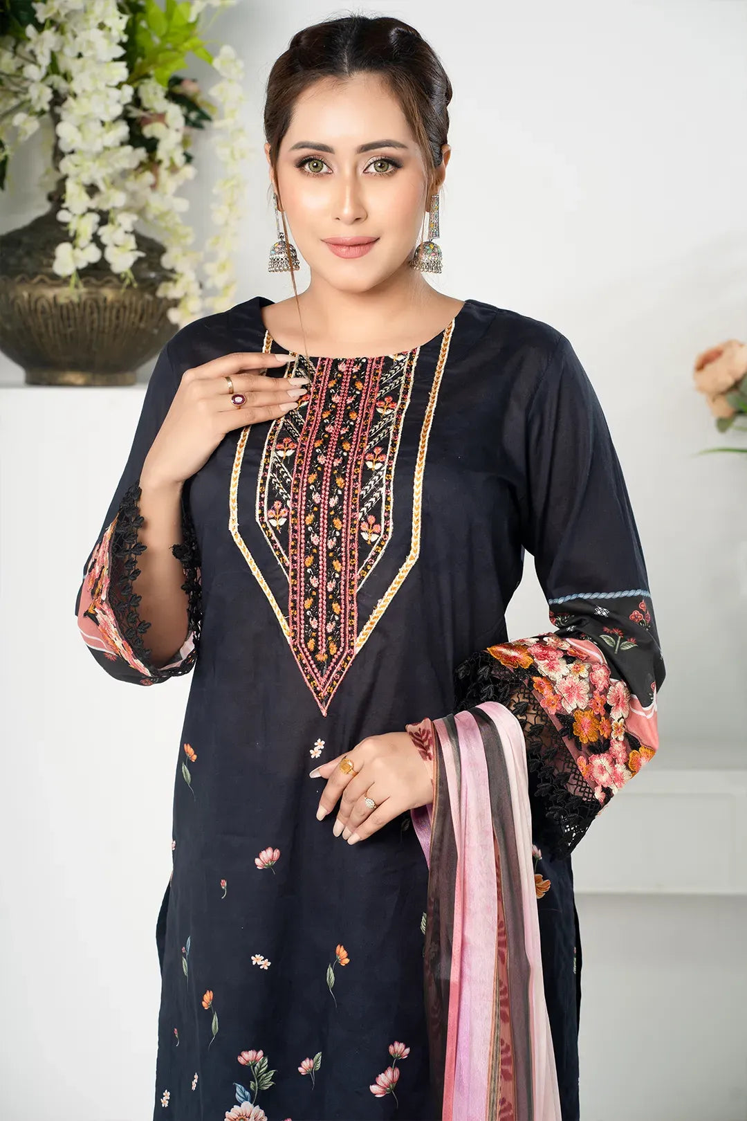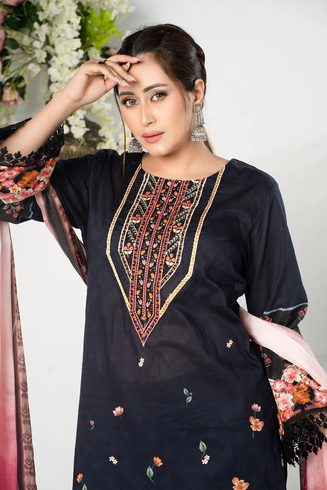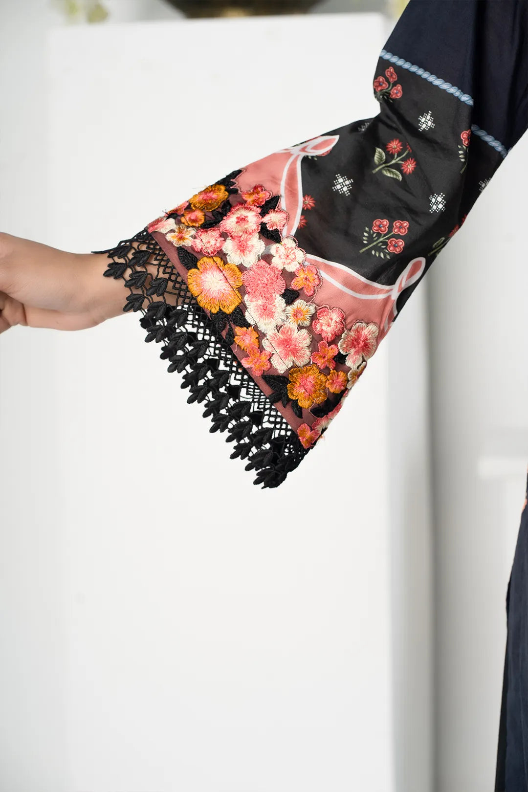 This exquisite three-piece set is a celebration of artistry and elegance, featuring vibrant digital prints with delicate embroidery and cotton lace detailing on premium lawn & organza fabric. The design includes a gracefully adorned long shirt with intricate details, paired with matching trousers and a beautifully coordinated dupatta. Perfect for festive occasions, this ensemble blends traditional craftsmanship with contemporary sophistication.